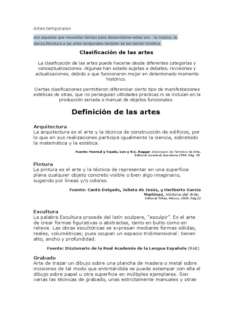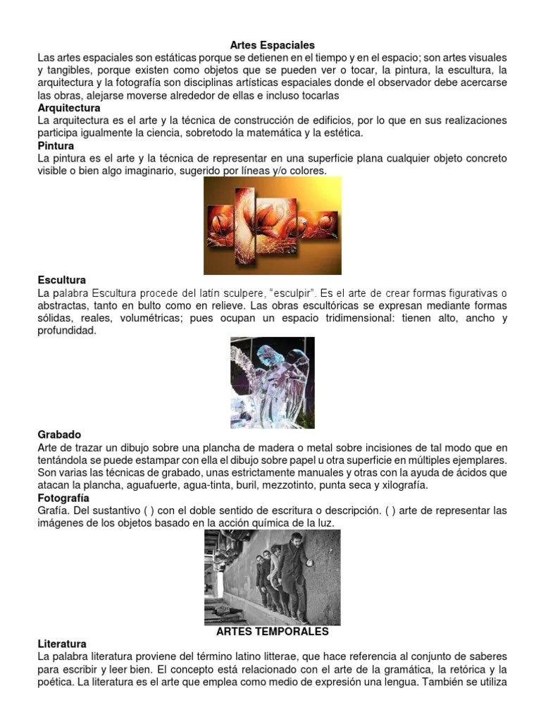 Pintura la pintura es el arte y la técnica de representar en una superficie plana cualquier objeto concreto visible o bien algo imaginario, sugerido por líneas y/o colores. Son artes visuales y tangibles, porque existen como objetos que se pueden ver o tocar, la pintura, la escultura, la arquitectura y la fotografía son disciplinas artísticas espaciales donde el observador debe acercarse las obras, alejarse moverse alrededor de ellas e incluso tocarlas. Clasificación de arte esquema de cómo se clasifica el arte espaciales. Dentro de la escultura, el uso de diferentes combinaciones de materiales y medios ha originado un nuevo repertorio artístico, que comprende procesos como el contructivismo y el assemblage. Es el ejecute de la mente en la proyección de... Escultura la palabra escultura procede del.