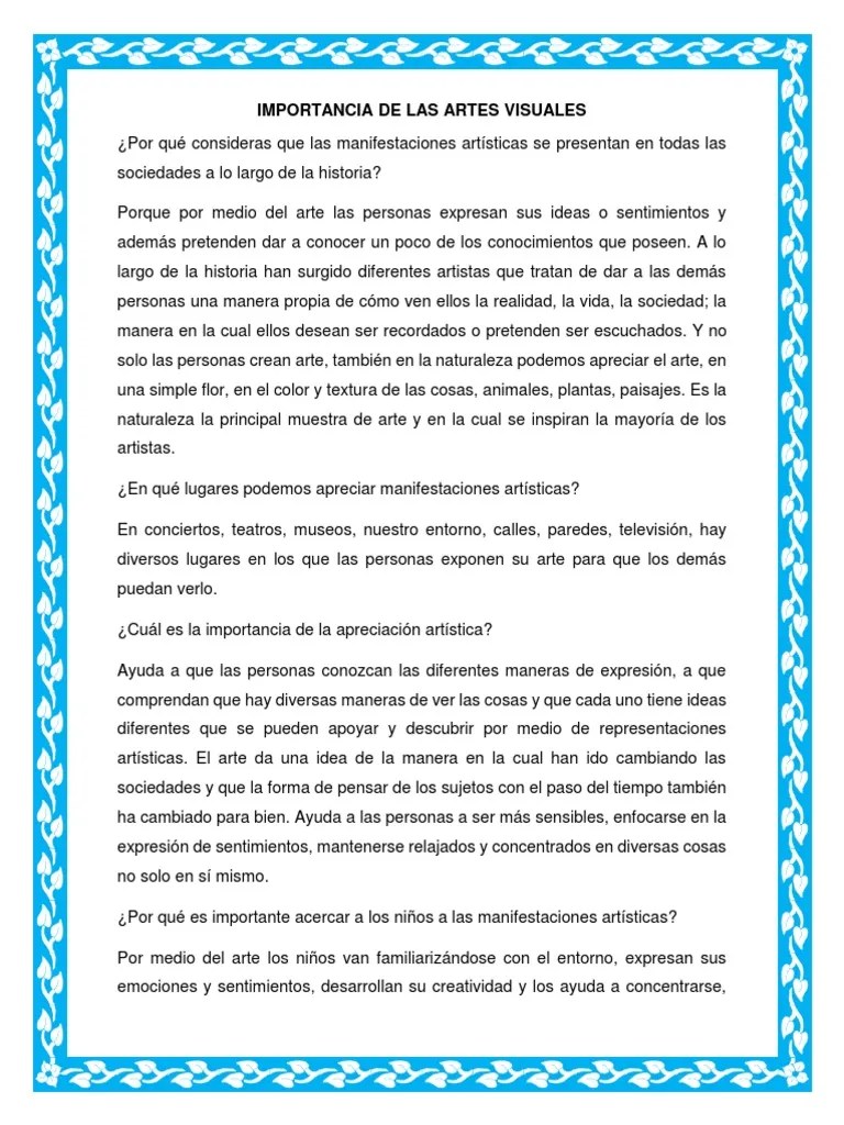 13.6.2020 · como se acaba de señalar, las artes visuales son todas aquellas expresiones artísticas que pueden disfrutarse gracias al sentido de la vista. 13.6.2020 · como se acaba de señalar, las artes visuales son todas aquellas expresiones artísticas que pueden disfrutarse gracias al sentido de la vista. El concepto de artes visuales surge tras la segunda guerra mundial para hacer referencia a las artes que implican una percepción visual, a las formas y expresiones enfocadas preeminentemente a la creación de trabajos que son visuales por naturaleza. Las artes visuales engloban las artes. El artista visual es multidisciplinario. Dentro de este tipo de arte se encuentra la pintura, la escultura, la arquitectura, el cine y la fotografía e incluso artes aplicadas tales como el diseño gráfico, el arte decorativo, entre otros. Las artes visuales tienen armonía, color, equilibrio, movimiento y perspectiva. 13.6.2020 · como se acaba de señalar, las artes visuales son todas aquellas expresiones artísticas que pueden disfrutarse gracias al sentido de la vista.