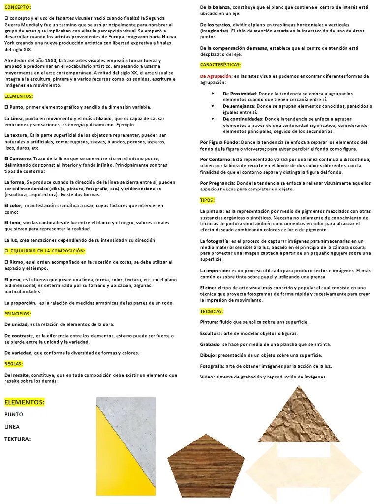 El concepto de artes visuales surge tras la segunda guerra mundial para hacer referencia a las artes que implican una percepción visual, a las formas y expresiones enfocadas preeminentemente a la creación de trabajos que son visuales por naturaleza... Dentro de este tipo de arte se encuentra la pintura, la escultura, la arquitectura, el cine y la fotografía e incluso artes aplicadas tales como el diseño gráfico, el arte decorativo, entre otros. Cuentan con ritmo y textura. Las artes visuales tienen armonía, color, equilibrio, movimiento y perspectiva. El artista visual es multidisciplinario. Las artes visuales engloban las artes. Las principales características de las artes visuales son las siguientes;